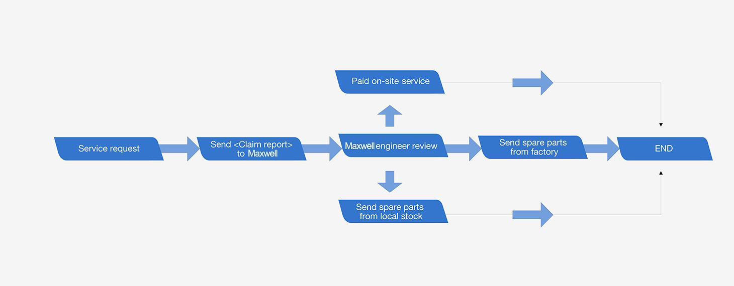 4. After confirmation with the reporters, the engineer will send the spares from local or factory warehouse for repairing purpose; or notify designated service center to provide the service onsite or send Maxwell engineers if necessary to solve the problem;